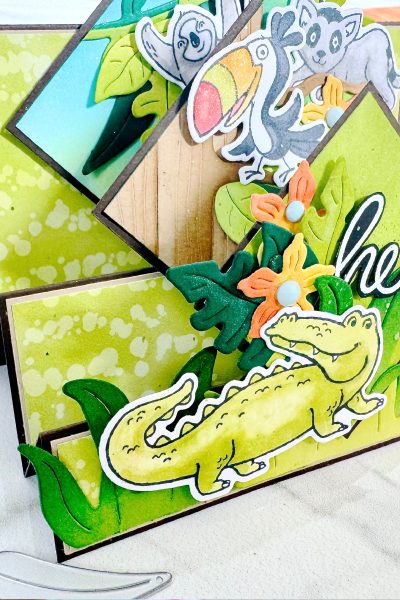 I am loving my weekly check ins and Facebook lives/classes with everyone over on my Facebook Page + doing up a FREE PDF to download. It is proving to be very popular and I am loving doing them. This week I featured a Triple Diamond Stepper Card which was a blast to make! When I saw the Jungle Pals stamps…